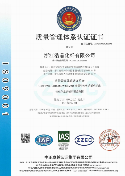 Chiết Giang Haojing Chemical Fiber Co., Ltd. tọa lạc tại thành phố Chư Kỵ, tỉnh Chiết Giang, được mệnh danh là "Quê hương của Tây Thi", liền kề lối vào Đường cao tốc Hàng Châu-Kim Hoa-Quzhou và chỉ cách Sân bay Quốc tế Tiêu Sơn Hàng Châu một giờ lái xe. Đây là một doanh nghiệp tư nhân chuyên sản xuất và kinh doanh sợi nylon đàn hồi. Các sản phẩm chính của công ty bao gồm máy tạo kết cấu BARMAG và các thiết bị tiện ích công cộng hỗ trợ khác nhau. Các sản phẩm chính là sợi AB, sợi nylon không nhuộm, sợi nylon đa lỗ mịn 6 và nylon 66, DTY nylon phân biệt chức năng và sợi phủ, sợi xoắn đôi và các sản phẩm dòng nylon khác. Công ty có nguồn dự trữ kỹ thuật cực kỳ lớn về các loại sợi khác nhau và đạt đẳng cấp quốc tế. Các sản phẩm được sản xuất được sử dụng rộng rãi trong dệt kim, dệt, sợi phủ spandex, dệt kim dọc, v.v. Để đảm bảo chất lượng sản phẩm, một bộ thiết bị kiểm tra và thử nghiệm hoàn chỉnh đã được giới thiệu đặc biệt và hệ thống quản lý chất lượng toàn diện đã được triển khai. Nó có công suất sản xuất hàng năm là 120.000 tấn sợi nylon. Khách hàng trong nước của chúng tôi trải dài trên 20 tỉnh, thành phố và sản phẩm của chúng tôi cũng được xuất khẩu sang Đông Âu.